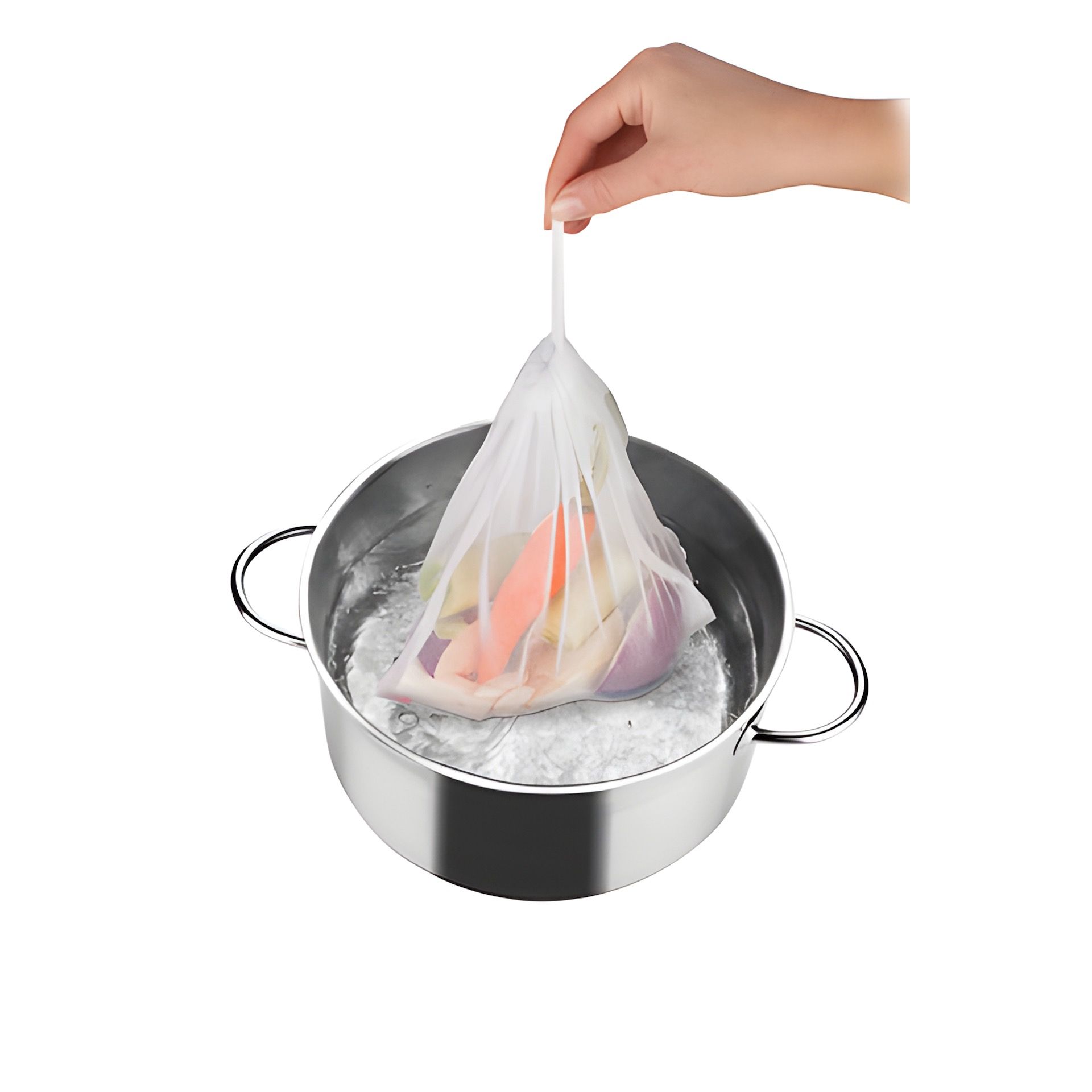 Das wiederverwendbare Kochnetz aus festem synthetischem Gewebe ist hervorragend geeignet, um Gemüse, Hülsenfrüchte, Gewürze und Kräutermischungen bei der Zubereitung von klaren Brühen, Eintöpfen oder Schmorgerichten separat auszukochen. Es hat ein Zugband, mit dem man den Beutel fest zuschnüren kann.
