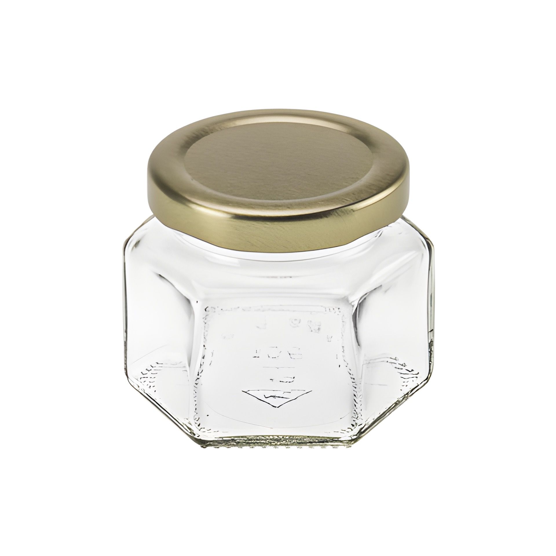 Sechskantglas in flacher Form mit 100 ml Nennvolumen, das als Einmachglas für Senf, Chutney und Konfitüre einiges her macht. Das formschöne Marmeladenglas kann natürlich auch sehr gut für Honig verwendet werden. Die sechseckige Schmuckform ist äußerst ansprechend und dekorativ, deshalb ist dieses ausgefallene Gläschen gerade für Geschenkkörbe und kleine Präsente besonders geeignet.
